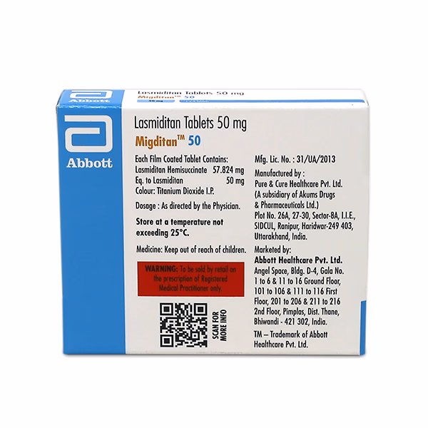 Migditan 50 Tablet is prescribed for the relief of migraine attacks. It helps alleviate symptoms and stops the migraine episode from worsening. However, it is not intended for long-term prevention of migraines. This medication can be taken with or without food, depending on your preference. Always use the dosage recommended by your doctor and avoid exceeding the prescribed amount or duration. The tablet works by blocking pain signals in the brain and reducing inflammation of nerves that contribute to migraine symptoms. It is used for treating active migraine episodes and does not lower the number of attacks over time. Some common side effects may include dizziness, tiredness, tingling sensations (paresthesia), and drowsiness. These effects are generally mild and temporary, but you should contact your doctor if they persist or cause discomfort. Since the medicine can cause sleepiness, avoid driving or operating heavy machinery until you know how it affects you. If you have a history of heart conditions, it’s important to inform your doctor, as the medicine may not be safe for certain cardiac issues. Blood pressure may need to be monitored while taking this medication. Pregnant or breastfeeding individuals should consult a healthcare professional before use. Caution is advised when consuming alcohol, as it may increase the risk of side effects. Patients with severe liver or kidney conditions should use the medicine carefully, and dosage adjustments might be necessary. In case you miss a dose, take it as soon as you remember. If it is almost time for your next scheduled dose, skip the missed one—do not take a double dose. Migditan 50 Tablet supports better blood flow in the brain and helps regulate nerve activity linked to migraines, ultimately helping you resume normal activities and improving overall well-being during an attack.