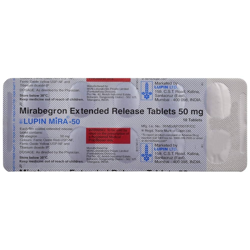 Mira 50mg Tablet contains Mirabegron, a medicine used for the management of overactive bladder (OAB). It works by relaxing the bladder muscles, which increases the bladder’s capacity to hold urine and reduces sudden urges. Doctors prescribe it to patients who experience frequent urination, urgency, or leakage due to OAB.