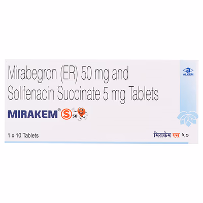 Mirakem S 50mg/5mg Extended-Release Tablet is a combination medication used to relieve symptoms related to an overactive bladder. It helps reduce issues such as frequent urination, sudden urges to urinate, and difficulty controlling urination by relaxing the bladder muscles.