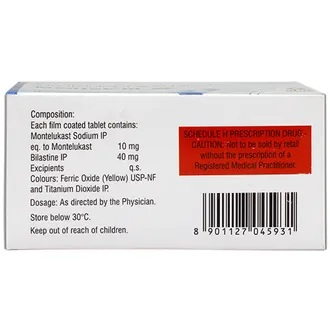 It contains Bilastine and Montelukast. Bilastine blocks histamine to reduce itching, swelling, and redness, while Montelukast blocks leukotrienes, chemical messengers responsible for airway inflammation and allergy symptoms.