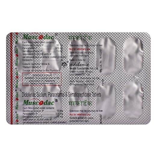 Muscodac Tablet combines three active agents – Diclofenac, Paracetamol, and Serratiopeptidase. Diclofenac belongs to the group of non-steroidal anti-inflammatory drugs that reduce pain and swelling. Paracetamol helps control fever and enhances pain relief. Serratiopeptidase is an enzyme that promotes healing by breaking down certain proteins at the site of inflammation. Together, they provide stronger and faster relief.