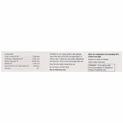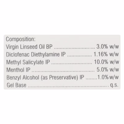 The formulation works in two steps. Menthol cools the skin, followed by a warming effect that distracts nerve endings from pain signals. At the same time, diclofenac and methyl salicylate reduce the release of chemicals responsible for inflammation and pain. Linseed oil adds an anti-inflammatory action, making the gel effective for both acute and chronic discomfort.