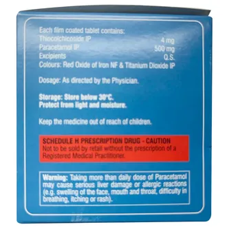 This tablet contains Paracetamol and Thiocolchicoside. Paracetamol acts as a pain reliever and fever reducer by blocking chemical messengers in the brain that cause pain and fever. Thiocolchicoside relaxes muscles by acting on the brain and spinal cord, reducing stiffness and spasms for improved comfort and movement.