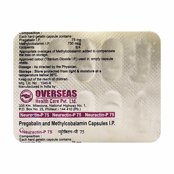 Neuractin P 75 Capsule is a **neuropathic pain-relief medicine** formulated to manage pain caused by nerve damage due to diabetes, shingles, spinal cord injury, or other nerve-related conditions. It combines **Pregabalin** and **Methylcobalamin**, two powerful ingredients that work synergistically to protect nerves, reduce pain, and restore normal nerve function.