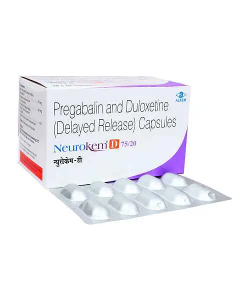 Neurokem D 75mg/20mg Capsule is used to treat neuropathic pain by regulating calcium channels in nerve cells, which helps reduce pain signals. It also raises the levels of certain brain chemicals that support mental balance and inhibit the transmission of pain signals.