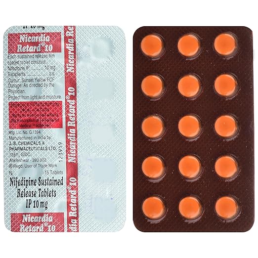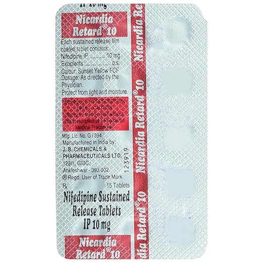 Nicardia Retard 10 Tablet SR works by relaxing the blood vessels, allowing blood to flow more easily. This reduces the pressure on the heart, decreases its workload, and improves oxygen supply, which helps prevent chest pain and other heart-related complications.