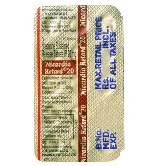 Nicardia Retard 20 Tablet SR is a prescription medicine commonly used to manage high blood pressure (hypertension) and to prevent episodes of chest pain caused by angina. It belongs to a group of medicines known as calcium channel blockers. This medicine works by relaxing the blood vessels, which helps to reduce blood pressure and decrease the strain on the heart, lowering the risk of heart attacks and strokes.