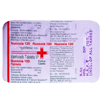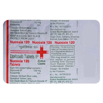 **Nucoxia 120 Tablet** is a prescription medication used to **relieve pain and reduce inflammation** associated with conditions such as **arthritis, musculoskeletal disorders, and acute pain episodes**. It is formulated to provide **effective and targeted relief** from discomfort.