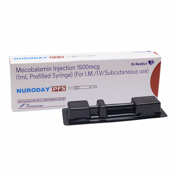 Nuroday PFS Injection provides a synthetic form of vitamin B12, designed to address deficiencies in the body. Vitamin B12 plays a vital role in supporting growth, forming new cells, producing red blood cells, and synthesizing proteins and tissues. It is also helpful in managing anemia, fatigue, and sensations such as tingling or numbness in the hands and feet.