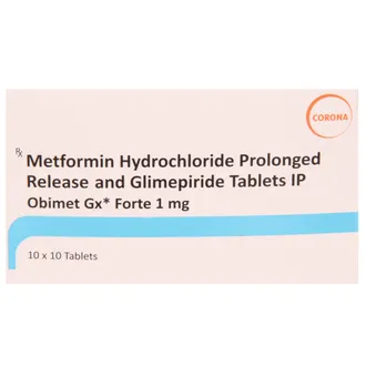 Obimet GX Forte 1mg Tablet PR combines two medicines: Glimepiride, which stimulates insulin release from the pancreas, and Metformin, which reduces glucose production in the liver, slows glucose absorption from the gut, and enhances insulin sensitivity. By controlling blood sugar levels, it helps reduce the risk of complications such as kidney damage, nerve problems, vision impairment, and limb issues. Regular use, alongside proper diet and exercise, supports a healthy and normal lifestyle.