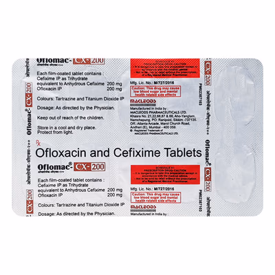Oflomac CX 200 mg/200 mg Tablet is a combination antibiotic medicine containing Ofloxacin and Cefixime, used to treat a wide range of bacterial infections. It is effective against infections of the urinary tract, respiratory tract, gastrointestinal tract, ear, throat, and certain sexually transmitted diseases. By combining two strong antibiotics, it provides broad-spectrum coverage against both gram-positive and gram-negative bacteria. Oflomac CX 200 mg/200 mg Tablet works by inhibiting the growth and multiplication of harmful bacteria, thereby helping the body fight infection more effectively. This medicine should always be taken under medical supervision and for the full prescribed course, even if symptoms improve earlier, to prevent antibiotic resistance. With proper usage, it helps restore health, reduces infection-related complications, and improves overall recovery in patients suffering from bacterial infections.