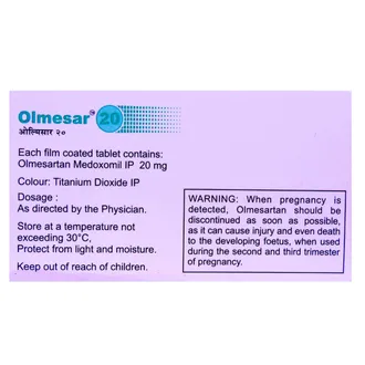 Olmesar 20 Tablet is a prescription medication used to manage high blood pressure (hypertension) and reduce the risk of cardiovascular complications. It contains Olmesartan Medoxomil, which belongs to the class of angiotensin II receptor blockers (ARBs). By relaxing blood vessels and improving blood flow, Olmesar 20 Tablet helps lower elevated blood pressure, protecting the heart, kidneys, and arteries from damage. Regular use, along with lifestyle modifications like a balanced diet, reduced salt intake, and regular exercise, helps maintain healthy blood pressure levels and reduces the risk of heart attack, stroke, and kidney-related issues. Olmesar 20 Tablet is generally taken once daily, with or without food, and requires adherence to the prescribed schedule for optimal results.