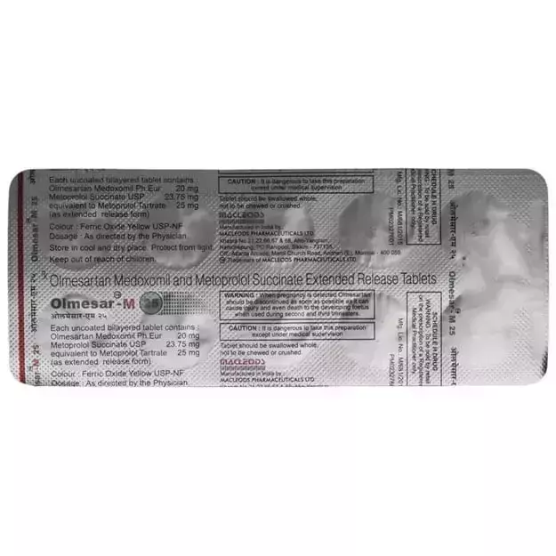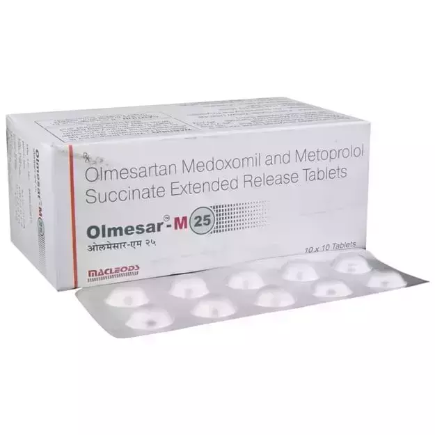 Olmesar-M 25 Tablet ER is a prescription medication used to manage high blood pressure (hypertension) and associated cardiovascular risks. It is a combination of Olmesartan Medoxomil, an angiotensin II receptor blocker (ARB) that relaxes blood vessels, and Metoprolol Succinate, a beta-blocker that reduces heart rate and workload on the heart. This extended-release (ER) formulation provides a steady, controlled release of medication throughout the day, helping maintain consistent blood pressure levels. By lowering elevated blood pressure and reducing strain on the heart, Olmesar-M 25 Tablet ER helps protect the heart, kidneys, and blood vessels, reducing the risk of heart attack, stroke, and other complications. Optimal results are achieved when used alongside lifestyle measures such as a balanced diet, reduced salt intake, regular exercise, and avoiding alcohol and smoking.