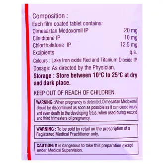 This medicine contains three components. Olmesartan medoxomil is an angiotensin receptor blocker that widens blood vessels. Cilnidipine is a calcium channel blocker that reduces tension in vessel walls. Chlorthalidone is a water pill that increases urine production and gradually relaxes blood vessels. Together, these three actions bring down high blood pressure effectively.