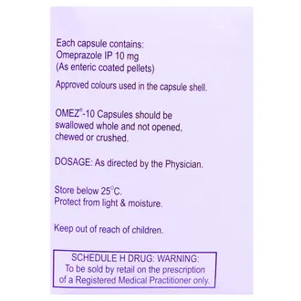 Omez 10 Capsule is a medicine that helps control the excess acid produced in the stomach. It is prescribed for problems related to acidity such as heartburn, acid reflux, ulcers in the stomach or intestine, and certain rare conditions like Zollinger–Ellison syndrome. By lowering acid levels, it provides relief from discomfort and also allows the lining of the stomach and food pipe to heal properly.