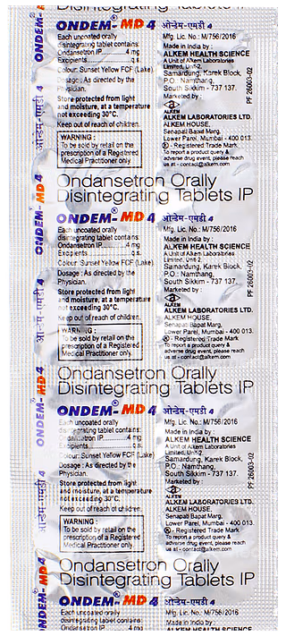 Ondem -MD 4 Tablet is a medication used to manage nausea and vomiting resulting from various health conditions, including stomach upset. It is also prescribed to prevent nausea and vomiting associated with surgery, chemotherapy, or radiotherapy.