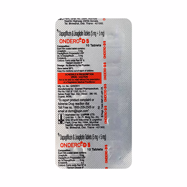 Ondero-D 5 Tablet is a combination medicine that contains Linagliptin (5mg) and Dapagliflozin (10mg). It is used for the management of type 2 diabetes mellitus to help control blood sugar levels. The medicine works by two mechanisms: Linagliptin improves insulin release and reduces excess sugar production, while Dapagliflozin helps remove extra sugar through urine. Together, they support better blood glucose control along with diet and regular exercise.