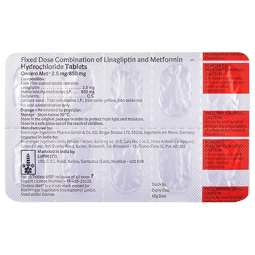 Ondero Met 850mg/2.5mg Tablet is prescribed to manage type 2 diabetes mellitus. It helps lower high blood sugar by making the body more responsive to insulin and by decreasing the amount of glucose formed in the liver.
