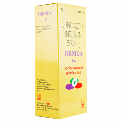 Ornida IV Infusion is a potent antibiotic solution designed to combat a broad spectrum of bacterial and parasitic infections. It is particularly effective for infections affecting the liver, stomach, intestines, urinary and genital tracts, lungs, heart, skin, brain, and other vital organs. This infusion is also used to prevent infections after surgery and to treat dental infections, leg ulcers, and pressure sores. Administered under the supervision of healthcare professionals, Ornida IV Infusion ensures rapid absorption and effective treatment for severe infections. It works by targeting the DNA of bacteria and parasites, stopping their growth and eliminating the infection. Completing the full prescribed course is crucial to prevent recurrence and resistance. Patients should avoid alcohol during treatment and maintain proper hydration. Pregnant or breastfeeding women must consult their doctor before use, and any history of liver, kidney, or nervous system issues should be disclosed to ensure safe administration.