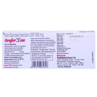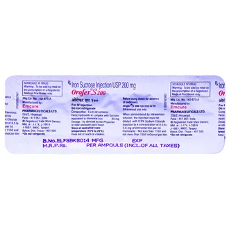 Orofer S 200 Injection is a specialized iron replacement therapy formulated to treat iron deficiency anemia, a condition where the body lacks sufficient red blood cells due to low iron levels. It is particularly beneficial for individuals who cannot tolerate oral iron supplements or require rapid improvement in iron stores. Administered under the supervision of a qualified doctor or nurse, this injection delivers iron directly into the bloodstream, ensuring faster absorption and efficient replenishment of iron reserves. Iron is essential for the production of hemoglobin, which enables red blood cells to transport oxygen to tissues and organs. By restoring iron levels, Orofer S 200 Injection helps reduce symptoms like fatigue, weakness, dizziness, and poor concentration, and promotes overall energy, vitality, and well-being. Regular monitoring and a balanced diet rich in iron, vitamins, and minerals complement the treatment for optimal recovery.