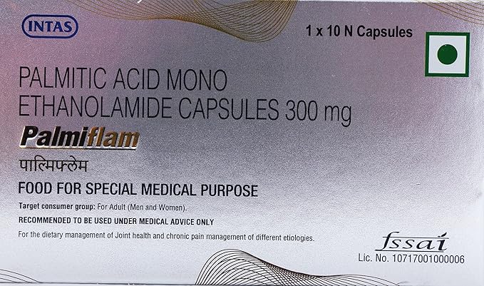 Palmiflam Capsule is formulated with Palmitoylethanolamide (PEA), a naturally occurring fatty acid amide known for its ability to support joint and nerve health. PEA is recognized for its anti-inflammatory and neuroprotective properties, making it useful in managing conditions related to nerve compression and joint discomfort. This supplement also includes probiotics, which play a role in maintaining a healthy gut environment and supporting smooth bowel function.