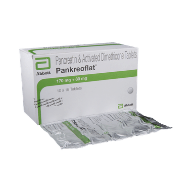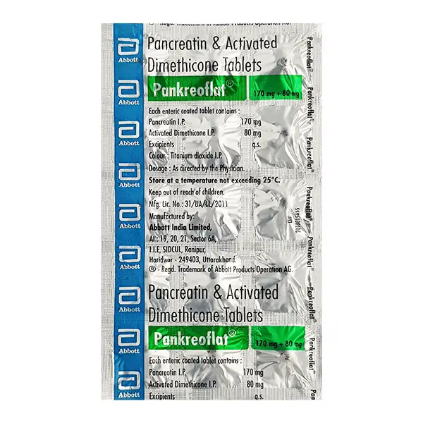 Pankreoflat 170mg/80mg Tablet combines two active ingredients to help manage indigestion and reduce bloating. This medicine supports proper digestion and facilitates the release of trapped gas in the stomach, providing relief from discomfort.