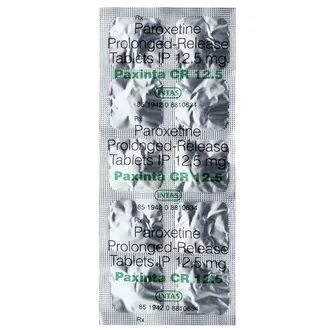 Paxinta CR 12.5 Tablet is an antidepressant belonging to the selective serotonin reuptake inhibitor (SSRI) group. It is commonly prescribed for the treatment of depression and anxiety-related disorders including obsessive-compulsive disorder (OCD), phobias, post-traumatic stress disorder (PTSD), and panic disorder. The medicine works by increasing serotonin levels in the brain, improving mood, and relieving anxiety, tension, and physical symptoms associated with depression. Paxinta CR 12.5 Tablet can be taken with or without food, but it is important to follow the dosage schedule prescribed by your doctor. The treatment is usually started at a lower dose and increased gradually to avoid side effects. Do not stop or change the dose without consulting your doctor, as sudden discontinuation may lead to withdrawal symptoms such as restlessness, dizziness, palpitations, sleep disturbances, and anxiety. Regular intake at the same time each day maximizes benefits, and it may take a few weeks before noticeable improvement occurs.