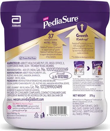 PediaSure Vanilla 400g is a scientifically designed nutritional powder with 37 vital nutrients that support healthy growth and development in children. It features the Nutri-Pull system, which helps enhance nutrient absorption by improving the uptake of essential elements like calcium, iron, and zinc. The Nutri-Pull system includes vitamin D for calcium absorption, vitamin K2 for proper calcium utilization, and casein phosphopeptides (CPPs) that are more easily digested and absorbed than whole protein. PediaSure includes growth-enhancing nutrients such as Arginine and Vitamin K2 to support the development of longer and stronger bones, along with 11 key immunity nutrients like Zinc, Selenium, Copper, and Vitamins A, C, and E to help maintain a strong immune system. Additionally, it contains neuronutrients including Linoleic Acid, Alpha-Linolenic Acid, Choline, Taurine, Magnesium, and Biotin that support brain development. The powder can be mixed with either milk or water. For preparation, mix 3 tablespoons (approximately 27.3g) of powder in 130 ml of milk, or 5 tablespoons (approximately 45.5g) in 190 ml of water. Stir well until fully dissolved. It is a gluten-free formula and not suitable for children with lactose intolerance or galactosemia. This product is not intended for infants or to replace breast milk. After opening, the foil pouch should be used within three weeks. Do not pour powder into the container; instead, store the foil pouch in a clean, airtight container in a cool, dry place away from sunlight. Avoid refrigeration. Fold the pouch properly after each use to prevent exposure to air and moisture.