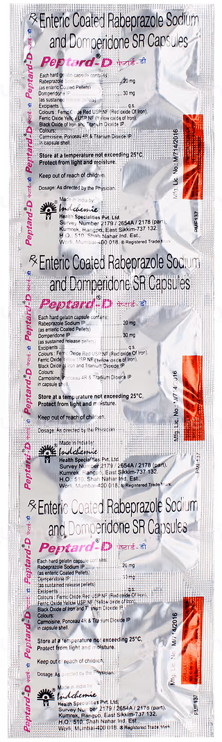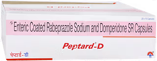 Peptard-D Capsule SR contains Domperidone, a prokinetic that helps the stomach and intestines move food efficiently, and Rabeprazole, a proton pump inhibitor that reduces stomach acid production, providing relief from heartburn and acid-related discomfort.