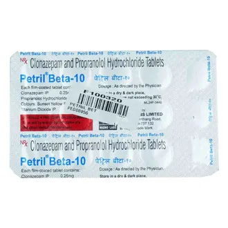 Petril Beta 20 Tablet contains Clonazepam and Propranolol. Clonazepam is a benzodiazepine that enhances GABA activity, helping to suppress overactive nerve signals in the brain. Propranolol is a beta blocker that moderates certain chemical messengers in the heart and blood vessels, reducing heart rate, blood pressure, and cardiovascular strain.