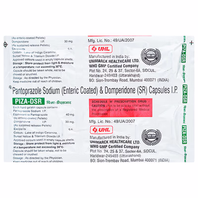 Piza-DSR Capsule is a prescription medicine used to treat gastroesophageal reflux disease, indigestion, and gastritis. It helps by reducing the amount of acid in the stomach, relieving symptoms such as heartburn, stomach pain, and irritation. The medicine also neutralizes stomach acid and promotes easy passage of gas, helping to reduce discomfort. Piza-DSR Capsule should be taken as prescribed by your doctor on an empty stomach. Consistent use is important as stopping early may worsen symptoms. Inform your doctor about all other medications you are taking to avoid interactions.