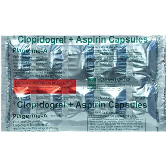 Plagerine-A 75 Tablet is a combination of two antiplatelet medicines, Aspirin and Clopidogrel, used to reduce the formation of harmful blood clots in the blood vessels. It helps prevent heart attacks, strokes, and complications related to acute coronary syndrome. By keeping the blood flowing freely, it reduces the risk of life-threatening events and helps protect the cardiovascular system. This medicine should be taken regularly with food, at a fixed time each day, as prescribed by your doctor. Stopping treatment early may increase your risk of clot formation and worsen your condition.