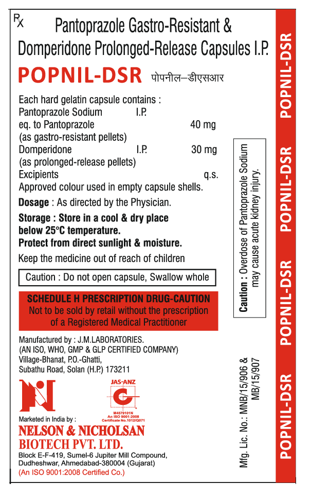 POPNIL-DSR is an advanced gastro-protective formulation designed to provide dual-action relief from acid-related and motility-related digestive disorders. It combines Pantoprazole 40 mg (EC) and Domperidone 30 mg (SR) to offer comprehensive gastrointestinal care. Pantoprazole, a proton pump inhibitor, works by reducing excessive stomach acid production, aiding in the healing of acid-induced ulcers and inflammation. Domperidone, a dopamine receptor antagonist, improves gastric motility and prevents symptoms like nausea, bloating, and vomiting. The enteric-coated and sustained-release design ensures optimal absorption and long-lasting therapeutic effect, making POPNIL-DSR particularly effective in managing GERD, acid reflux, functional dyspepsia, and other chronic digestive conditions while improving patient comfort and compliance.