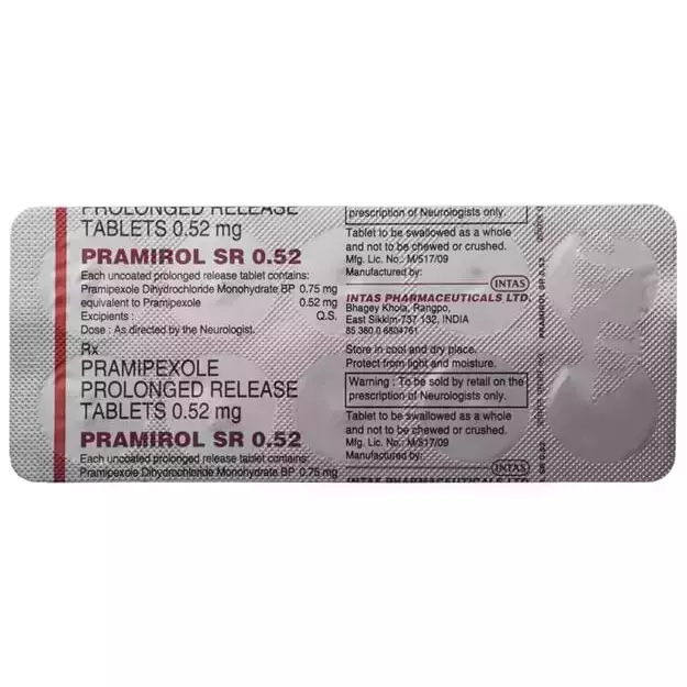 Pramirol SR 0.52 Tablet is a medicine used for managing Parkinson’s disease and restless leg syndrome, a condition that causes an uncontrollable urge to move the legs, often accompanied by discomfort. It helps reduce excessive shaking and improves movement by slowing abnormal body motions.