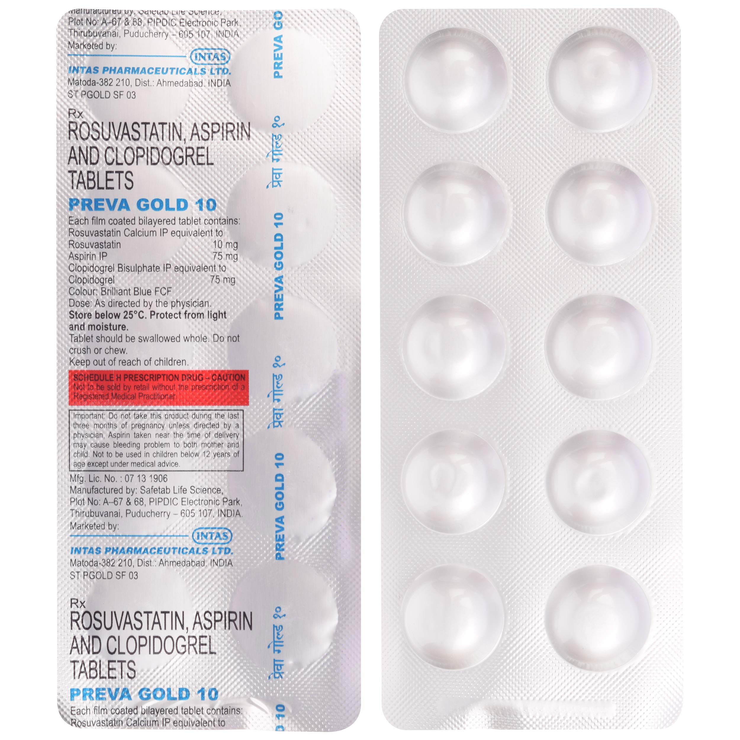Preva Gold 10 Capsule is a medicine used to lower the risk of heart attack, stroke, and to treat peripheral vascular disease. It contains a mix of medicines that work together to prevent the formation of blood clots and to manage cholesterol and triglyceride levels in the body.