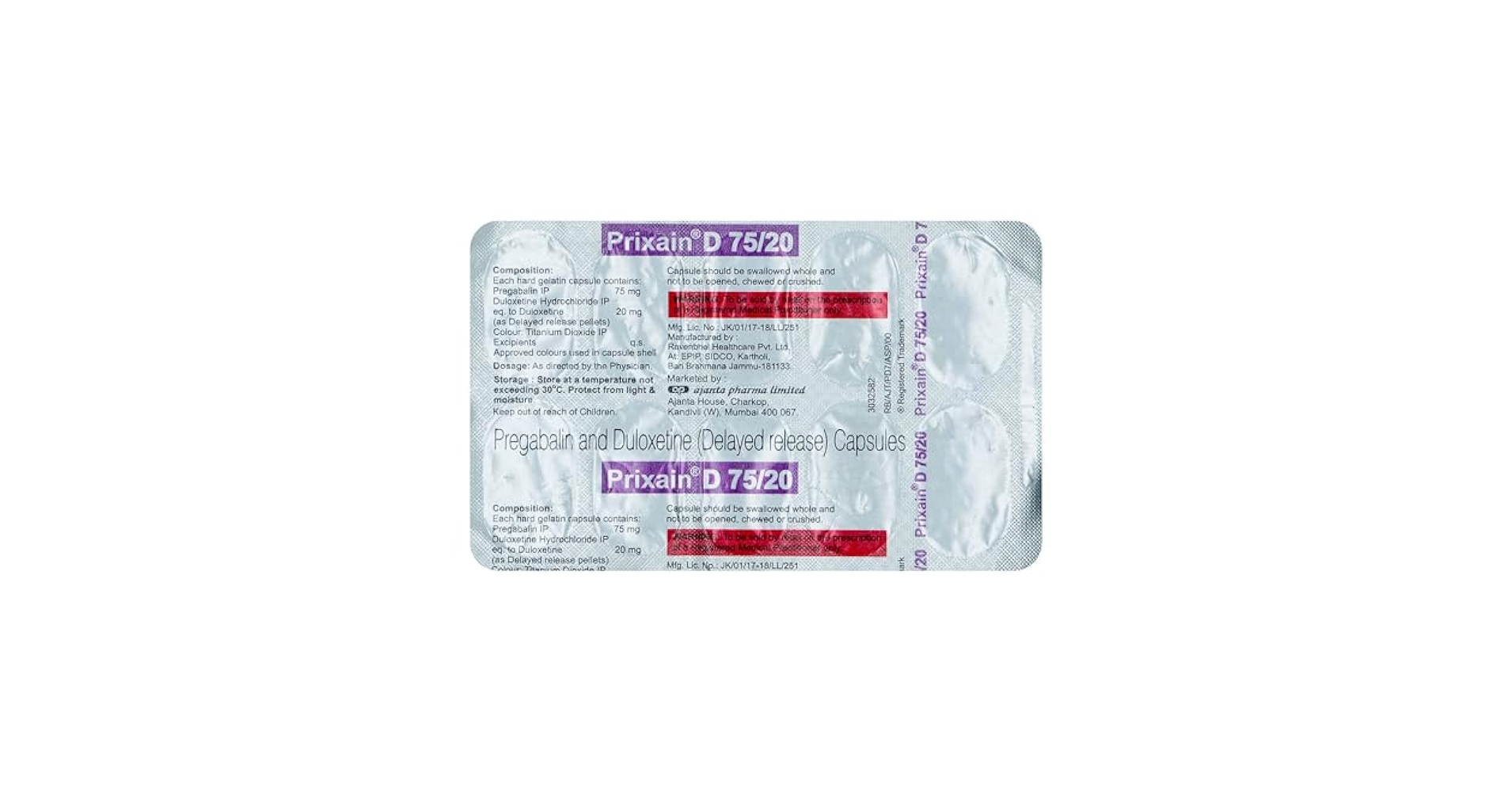 Prixain D 75mg/20mg Capsule DR is a combination medication primarily used to manage neuropathic pain, which can arise from conditions such as diabetes, spinal cord injuries, shingles (herpes zoster), or other nerve damage. This capsule works by altering the way nerves send pain signals to the brain, helping to reduce discomfort. It also enhances the levels of certain mood-stabilizing chemicals in the brain, which contributes to improved pain regulation.