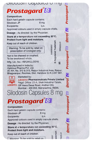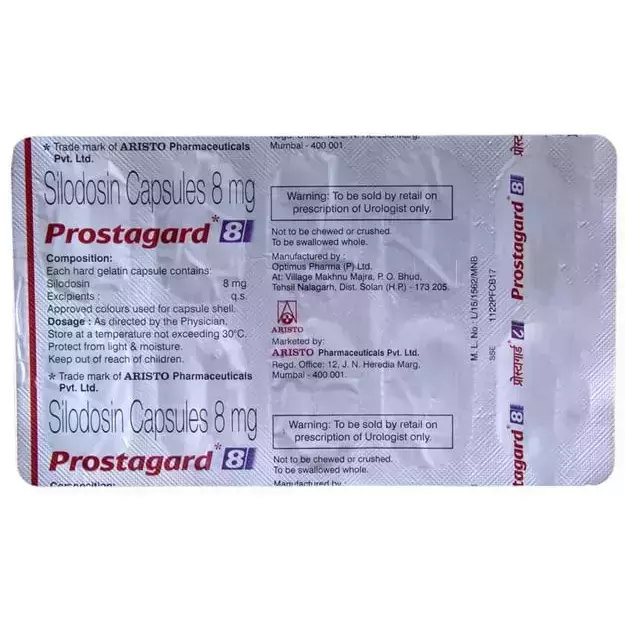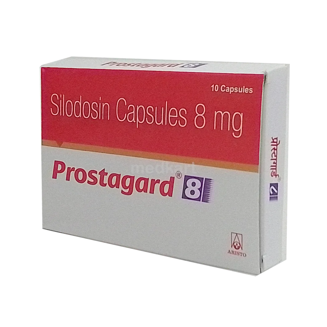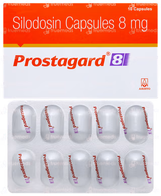 Prostagard 8 Capsule is a medication classified as an alpha-adrenergic antagonist, primarily used for managing benign prostatic hyperplasia (BPH). It helps to ease urinary symptoms such as difficulty in urination but does not actually shrink the prostate gland. This medicine should be taken exactly as directed by a healthcare provider. It is best consumed along with food and should be taken at the same time daily for optimal effectiveness. The capsule should be swallowed whole without breaking, chewing, or crushing it. Do not stop taking the medicine suddenly without consulting your doctor, as doing so may worsen your condition. Completing the full course of treatment ensures better outcomes.