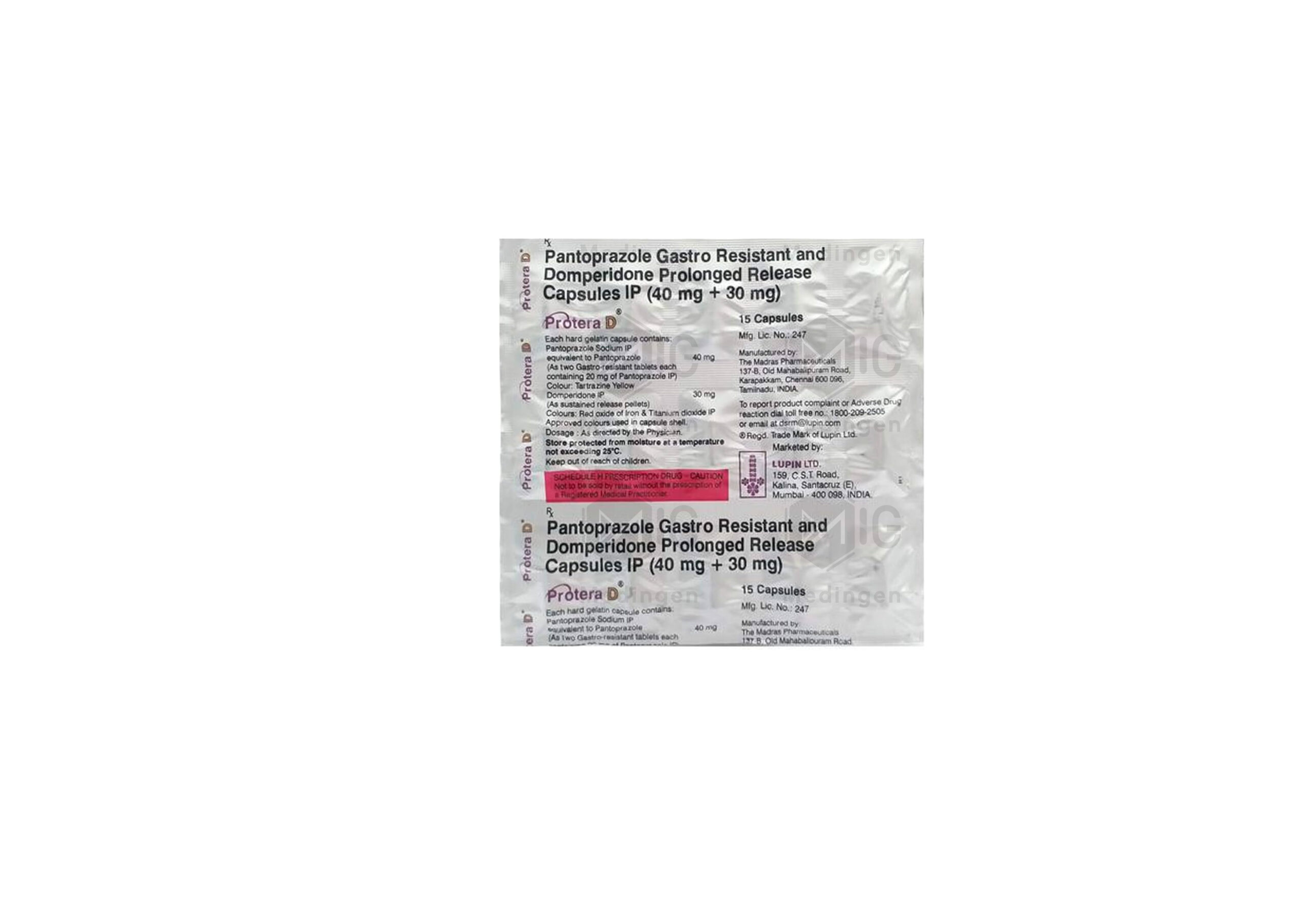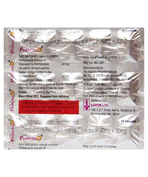 Protera D Capsule is a combination medicine used for managing acid-related stomach conditions along with digestive discomfort. It contains Lansoprazole (a proton pump inhibitor) and Domperidone (a prokinetic agent). Lansoprazole helps reduce excess acid in the stomach, while Domperidone improves the movement of food through the digestive tract, reducing symptoms such as nausea, bloating, heartburn, and acid reflux. This capsule is often prescribed for patients with gastroesophageal reflux disease (GERD), gastritis, and indigestion associated with delayed stomach emptying.