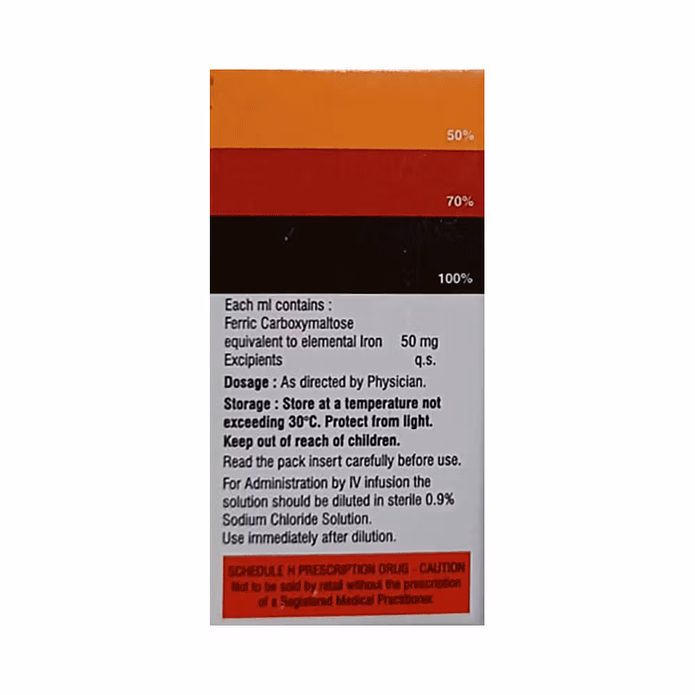 R B Tone FCM Injection is an intravenous preparation of ferric carboxymaltose, a form of iron that is given directly into the vein for the rapid correction of iron deficiency and iron deficiency anemia. It is especially useful in patients who are unable to tolerate oral iron supplements, those who do not respond to tablets, or those who need quick improvement in hemoglobin levels due to severe deficiency. This injection works by restoring depleted iron stores, which helps the body produce more hemoglobin and red blood cells, thereby improving oxygen supply to tissues. It is often used in chronic kidney disease, postpartum anemia, heavy blood loss, or in people with malabsorption problems. The injection is administered only under the supervision of a healthcare professional in a hospital or clinic setting. With proper use, R B Tone FCM Injection helps in reducing weakness, tiredness, shortness of breath, and enhances overall strength and vitality.