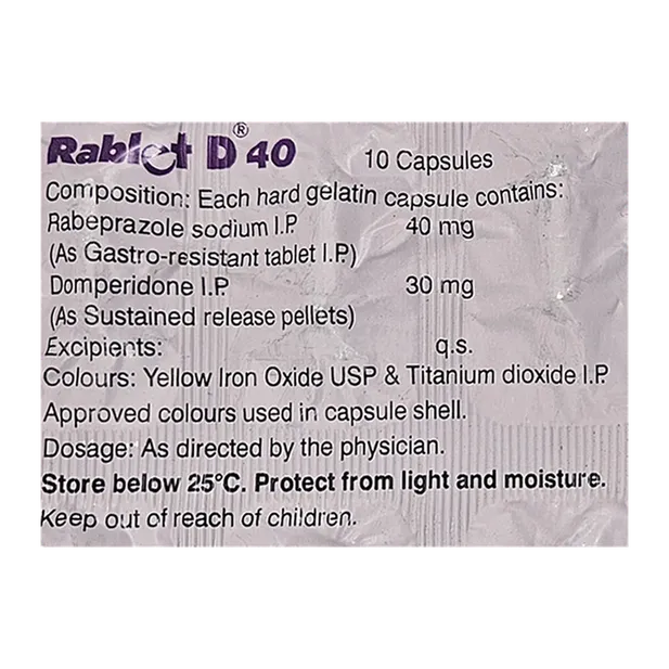 Rablet D 40 Capsule SR is a combination medicine that contains Rabeprazole (40 mg), a proton pump inhibitor, and Domperidone, a prokinetic agent. It is mainly prescribed for conditions caused by excess stomach acid and slow gastric emptying, such as gastroesophageal reflux disease (GERD), acidity, indigestion, heartburn, nausea, and bloating. It works by reducing acid production and improving the movement of food through the digestive tract, providing effective relief from discomfort.