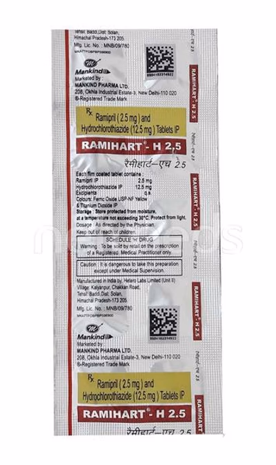 Ramihart-H 2.5 Tablet is a combination medicine used to manage hypertension (high blood pressure). It helps lower blood pressure, reducing the risk of heart attack, stroke, and kidney complications.