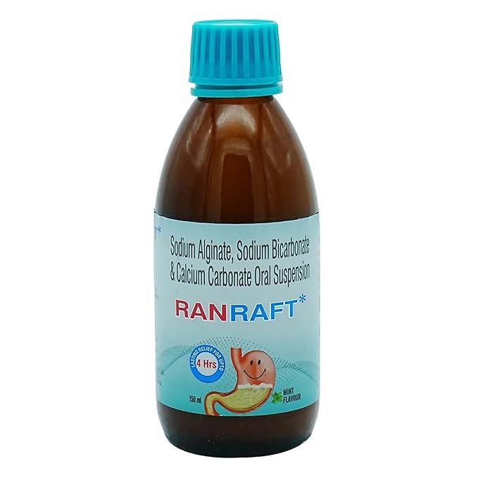 Ranraft Oral Suspension Mint contains three active ingredients: calcium carbonate, sodium bicarbonate, and sodium alginate. Calcium carbonate and sodium bicarbonate neutralize stomach acid and release carbon dioxide, forming a protective gel barrier that prevents acid from rising into the throat. Sodium bicarbonate also acts quickly to reduce acidity, while sodium alginate creates a floating gel layer on top of the stomach contents. This barrier protects the food pipe lining and provides fast, lasting relief from acid reflux symptoms for up to four hours.