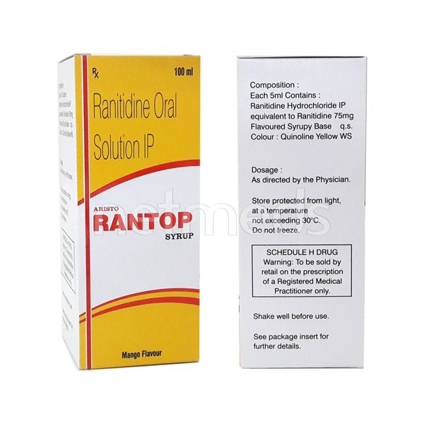 Rantop Syrup Mango is a medication designed to lower the amount of acid produced in the stomach. It is used to treat conditions such as heartburn, indigestion, stomach ulcers, acid reflux, and certain less common acid-related disorders. It also helps prevent ulcers and heartburn associated with prolonged use of painkillers.