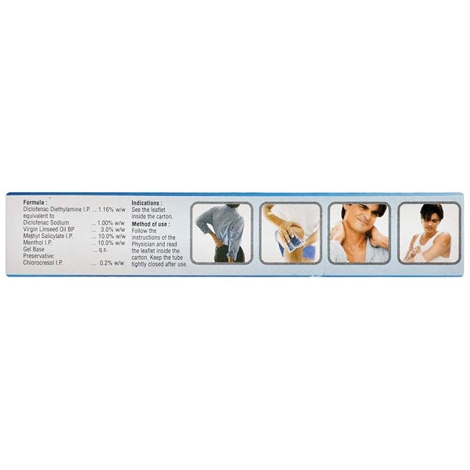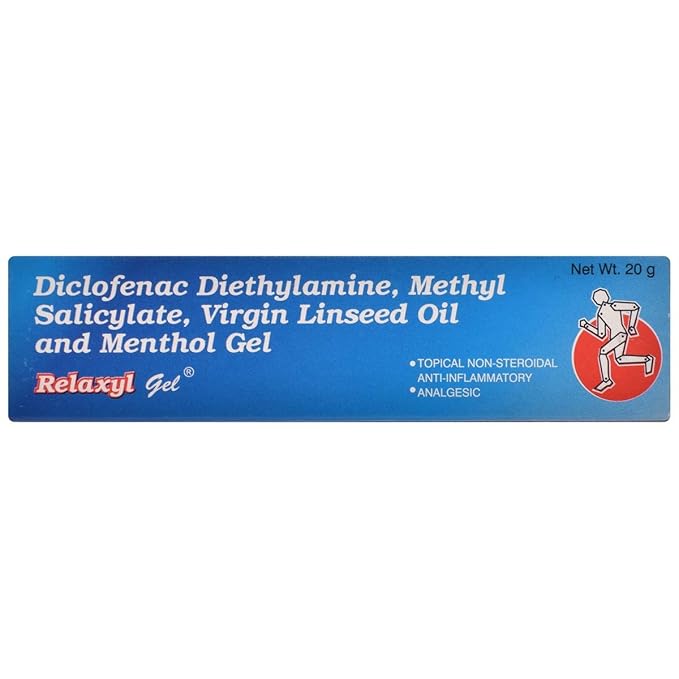 Relaxyl Gel usually contains Diclofenac Diethylamine, Methyl Salicylate, Menthol, and Linseed Oil.