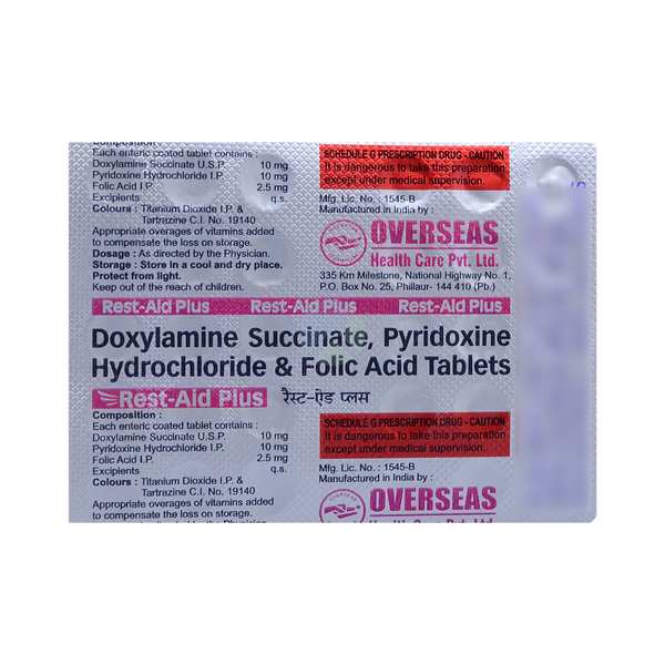 Rest Aid Plus Tablet is a combination medicine designed to relieve nausea and vomiting in pregnancy. It works by blocking the signals in the body that trigger queasiness and sickness, while also supplying essential vitamins for maternal support.