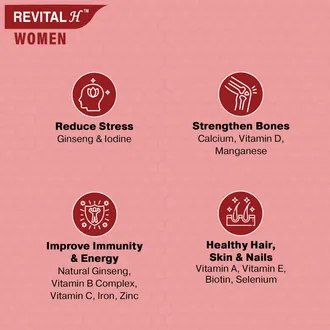 Revital Woman Tablet provides essential vitamins like A, C, D, and E along with minerals such as calcium, iron, and zinc. These nutrients improve energy, strengthen bones, maintain skin glow, and support reproductive health. Regular use helps in reducing tiredness, boosts immunity, and promotes overall wellness in women.