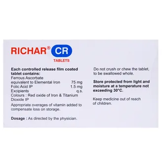 Richar CR 100 Tablet is a nutritional supplement mainly used to correct iron deficiency and anemia. It helps in the production of healthy red blood cells and improves oxygen supply in the body, thereby reducing tiredness and weakness.