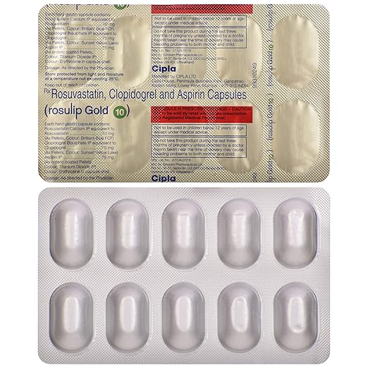 Rosulip Gold 10 Capsule is a combination medicine used to manage cholesterol levels and protect cardiovascular health. It helps lower bad cholesterol (LDL) and triglycerides, increase good cholesterol (HDL), and prevent abnormal blood clot formation, reducing the risk of heart attack and stroke.