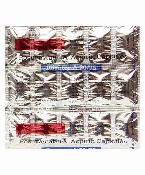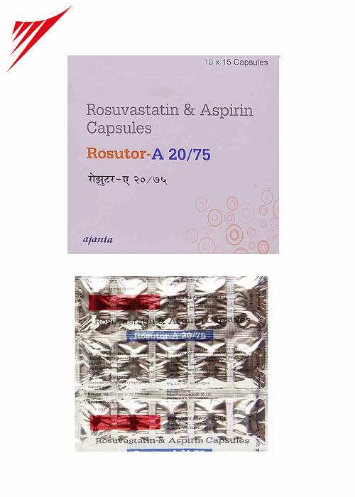 Rosutor-A 20/75 Capsule is a combination medication used to lower the risk of serious heart-related conditions such as heart attacks, strokes, and angina. It works by reducing levels of bad cholesterol (LDL) and triglycerides while also preventing the formation of harmful blood clots. The capsule contains rosuvastatin, which helps control cholesterol levels by inhibiting its production in the liver, and aspirin, which has antiplatelet properties that help maintain smooth blood flow by reducing clot formation. This medicine is generally taken with food to reduce stomach discomfort. It should be taken consistently at the same time every day, as directed by your doctor, for the best results. Do not discontinue the medication prematurely, even if you feel fine, as it plays a preventive role in managing long-term cardiovascular health. Lifestyle improvements such as adopting a balanced diet low in saturated fats, regular physical activity, quitting smoking, and maintaining a healthy weight can significantly enhance the effectiveness of this treatment. Some common side effects may include nausea, abdominal discomfort, constipation, headache, muscle pain, or a general feeling of weakness. While these effects are often mild and temporary, you should contact your doctor if they persist or worsen. Since this medicine can increase the risk of bleeding, extra care is advised during activities like shaving or using sharp tools. Any signs of unusual bleeding, yellowing of the skin or eyes, dark urine, or muscle pain should be reported to a healthcare provider promptly. Regular monitoring of kidney and liver function may be recommended during treatment. People with liver or kidney impairment, or a known bleeding disorder, should inform their doctor before starting this medicine. It is not considered safe during pregnancy or breastfeeding, so those who are pregnant, planning a pregnancy, or nursing should consult their doctor before use. Additionally, interactions with other medicines are possible, so provide your healthcare team with a complete list of any other treatments or supplements you are using. If you miss a dose, take it as soon as you remember, unless it’s almost time for your next dose. In that case, skip the missed dose and continue with your regular dosing schedule—do not take a double dose to make up for it.