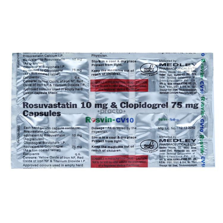 Rosvin CV Ten Capsule is a combination medicine that contains rosuvastatin and clopidogrel. It is mainly prescribed for patients who need both cholesterol control and prevention of blood clot formation. Rosuvastatin belongs to the group of statins which lower bad cholesterol and triglycerides while raising good cholesterol. Clopidogrel works as an antiplatelet agent that prevents platelets from sticking together and forming harmful clots inside blood vessels. Together, these medicines provide dual protection against heart attack, stroke and other cardiovascular complications. Doctors recommend this capsule especially for patients with high cholesterol and increased risk of clot formation due to previous heart problems or arterial disease. With regular use under medical supervision, Rosvin CV Ten Capsule helps maintain healthy blood circulation, reduces the risk of serious cardiac events, and supports long term heart and vascular health along with lifestyle modifications such as a balanced diet and regular exercise.